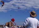 Note: (from Dave Shattuck)... This shot, taken from the current issue of Kitelife shows Nelson Borelli on the right and Luis Claris Skoczdopole on the left. The third person in the middle is Gustavo Di Si, who was flying the Skydancer in demonstration for the other two men. The location is along Paseo de la Costa (literally, "The Road along the Coast") in Vicente Lopez, the suburb just north of the city of Buenos Aires. The water shown behind the subjects is the Rio de la Plata, which is a huge estuary that separates Argentina from Uruguay.