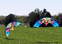 I finally came across my shots of Dave and a few of his kites from AKA Treasure Island 2000. I remember Con introducing me to Dave as "that guy who was buying so many of his kites" and then Con went off to fly his 6 stack. Dave started pulling kites out of his bag, setting them up, and encouraged me to test fly them. After about the 4th kite, Con landed his stack, came over and said "Dave, you've been holding out on me". I hadn't realized that Con had never seen some of these kites he was letting me fly. My first Skydancer (Rainbow with tails) is still my favorite. I still am very protective of my Fearsome Hawk that Betsy finally gave me permission to buy. And I still marvel that her brother, who couldn't keep a Beetle in the air for 10 seconds was flying a Fijet prototype without the tail. Dave will long be remembered for his marvelous kites.